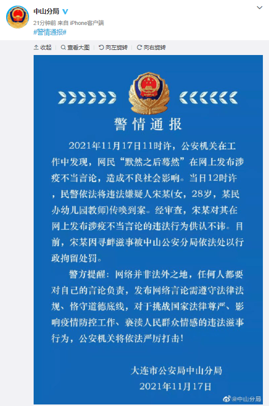 17日晚间,大连市公安局中山分局通报称,11月17日11时许,公安机关在工作中发现,网民“默然之后蓦然”在网上发布涉疫不当言论,造成不良社会影响。