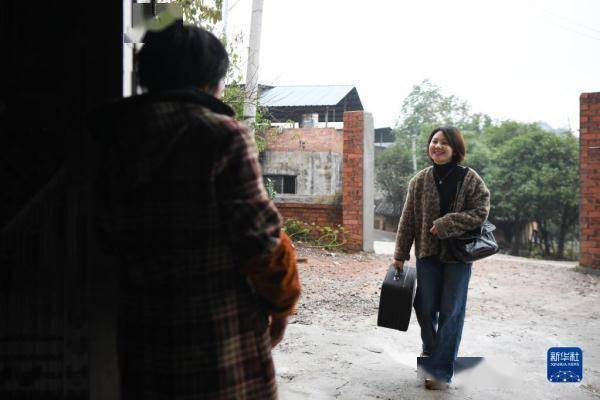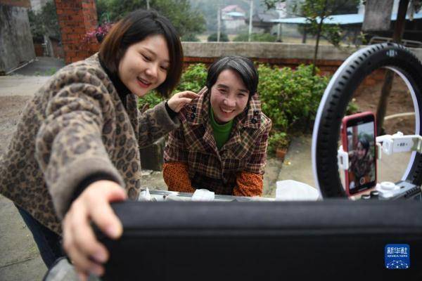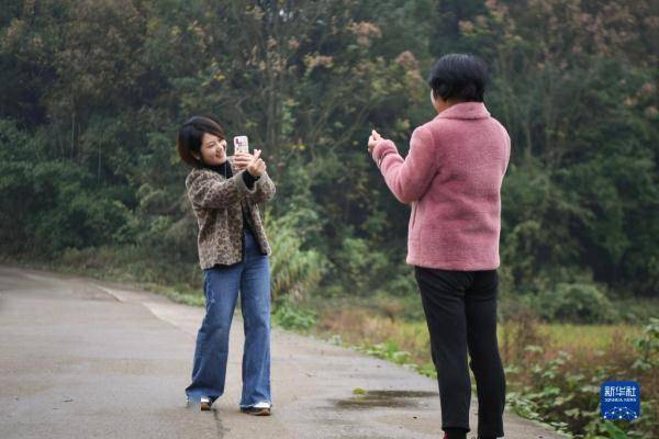 11月17日,周文娟(左)在湖南省永州市零陵区和谐村为村民蒋冬娥拍照。