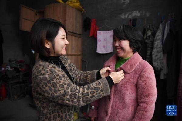 11月17日,周文娟(左)在湖南省永州市零陵区和谐村为村民蒋冬娥换上漂亮衣服。
