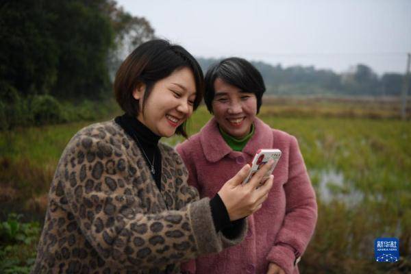 11月17日,周文娟(左)在湖南省永州市零陵区和谐村与村民蒋冬娥分享拍摄的照片。