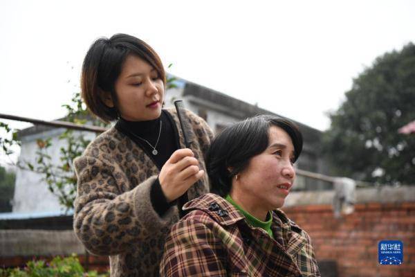 11月17日,周文娟(左)在湖南省永州市零陵区和谐村为村民蒋冬娥梳头。