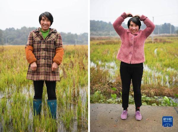拼版照片:左图为11月17日在湖南省永州市零陵区和谐村拍摄的造型前的村民蒋冬娥;右图为11月17日拍摄的造型后的蒋冬娥。