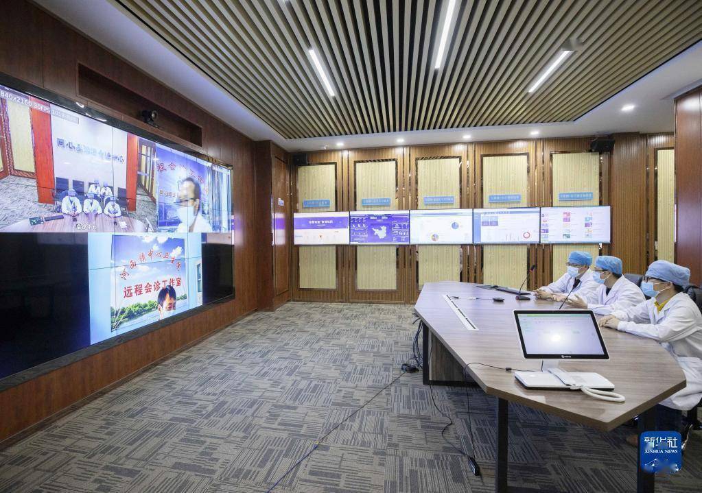 福建省泉州市第一医院医生在宁夏同心县人民医院通过远程会诊为同心县乡镇卫生院的医生提供指导(2020年9月18日摄)。新华社记者 王鹏 摄