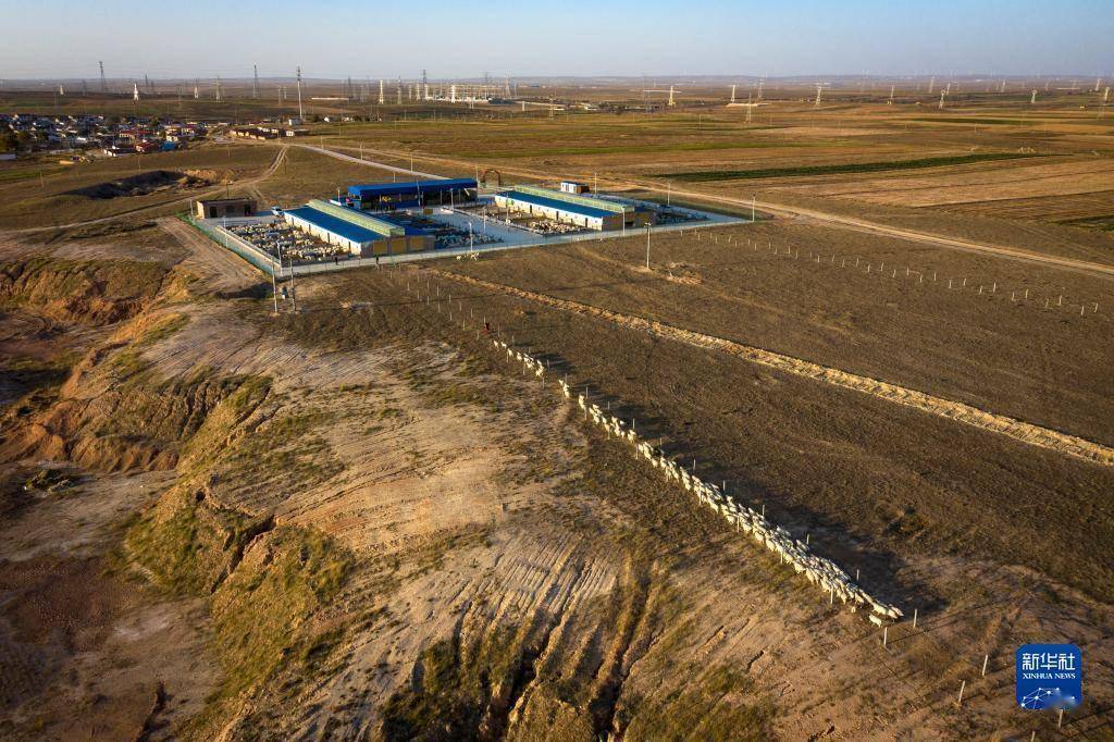 在宁夏吴忠市盐池县大水坑镇宋堡子村生态牧场,工作人员驱赶滩羊在跑道上“锻炼”,以提高肉质品质(2020年11月2日摄,无人机照片)。新华社记者 冯开华 摄