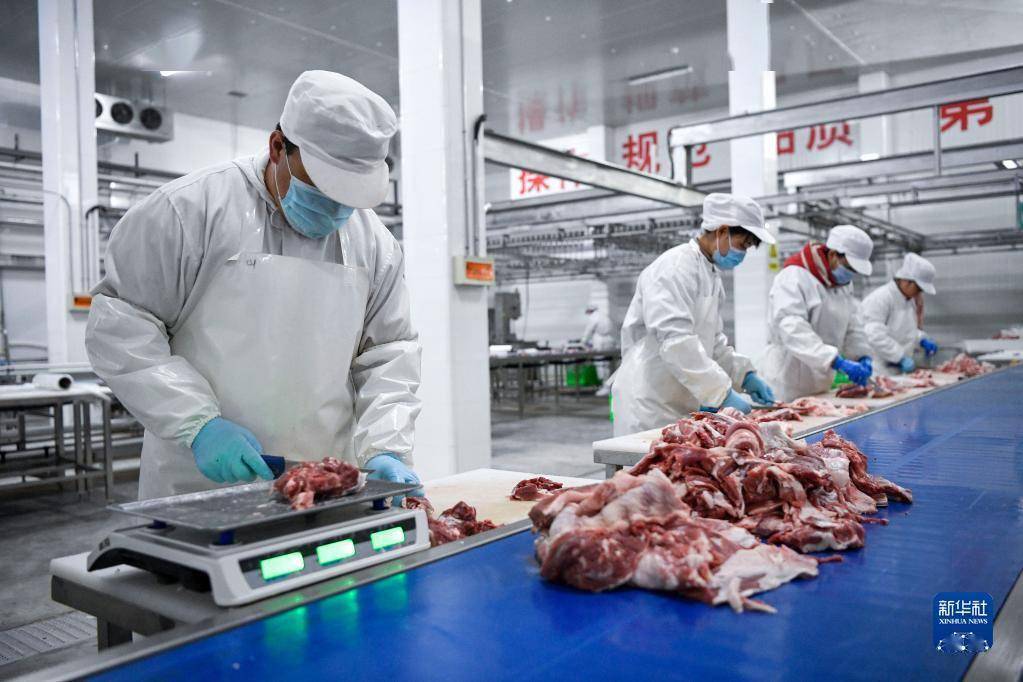 在宁夏盐池滩羊集团的高标准屠宰加工厂内,工人在精细分割滩羊肉(2020年11月2日摄)。新华社记者 冯开华 摄
