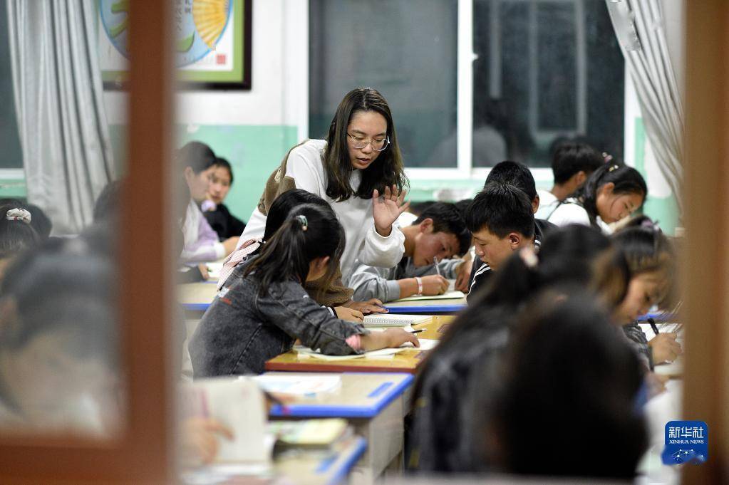 复旦大学第23届研究生支教团支教老师徐菁在晚自习上为宁夏西吉县王民乡王民中学学生解答问题(9月1日摄)。新华社记者 王鹏 摄