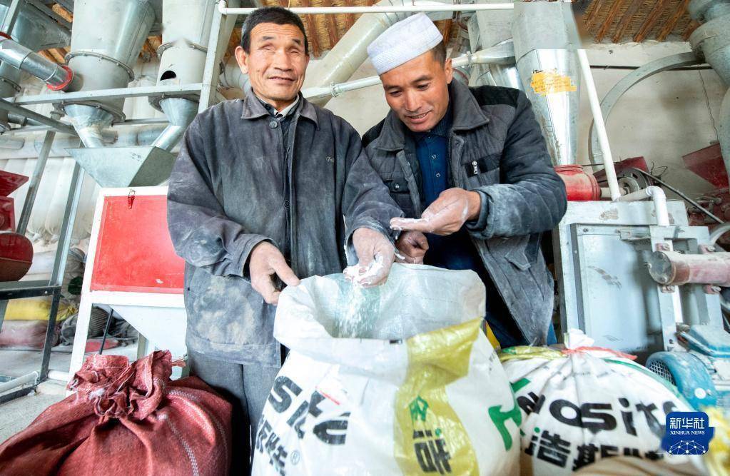 宁夏吴忠市红寺堡区农民马腾俊(左)和前来磨面的当地村民共同检查新磨出的面(2019年10月25日摄)。新华社记者 杨植森 摄