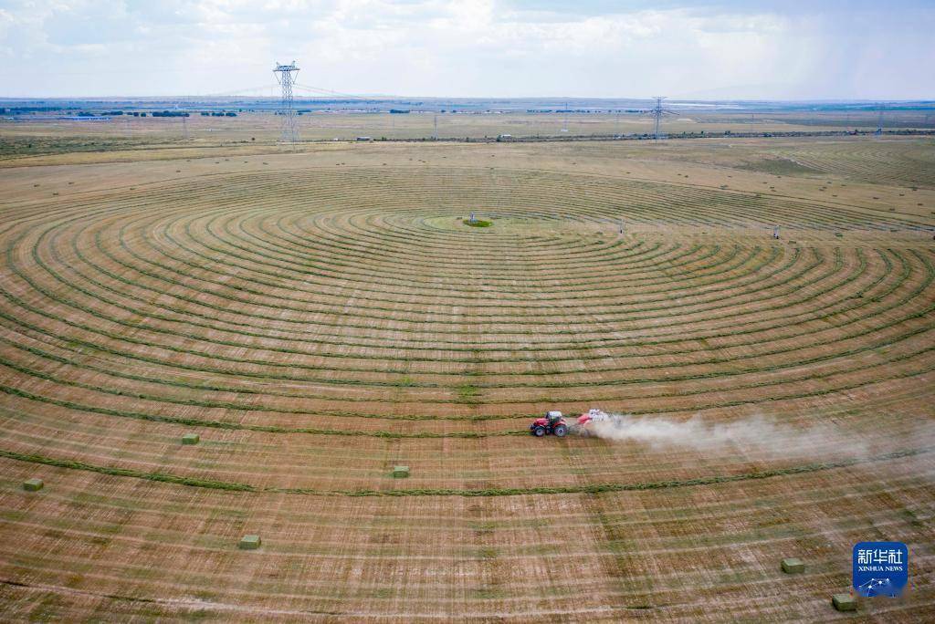在宁夏盐池县冯记沟乡平台村的优质牧草基地,农户用机械将牧草打捆(无人机照片,7月14日摄)。新华社记者 杨植森 摄