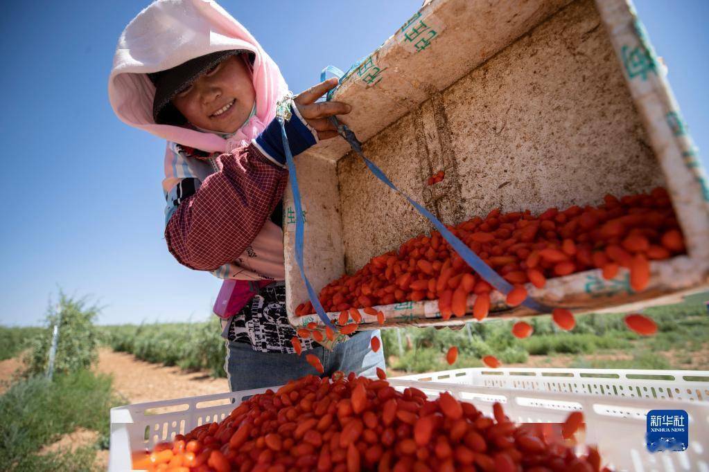 7月1日,在宁夏中宁县玺赞生态枸杞庄园,采摘工准备将采摘的枸杞称重。新华社记者 杨植森 摄