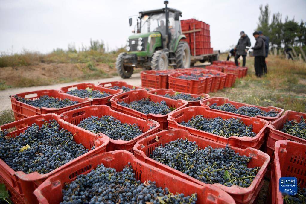工人在宁夏西鸽酒庄葡萄园搬运采摘下的酿酒葡萄(10月14日摄)。新华社记者 王鹏 摄