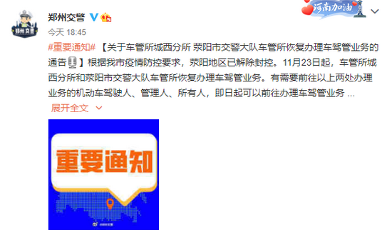 根据我市疫情防控要求,荥阳地区已解除封控。11月23日起,车管所城西分所和荥阳市交警大队车管所恢复办理车驾管业务。有需要前往以上两处办理业务的机动车驾驶人、管理人、所有人,即日起可以前往办理车驾管业务。