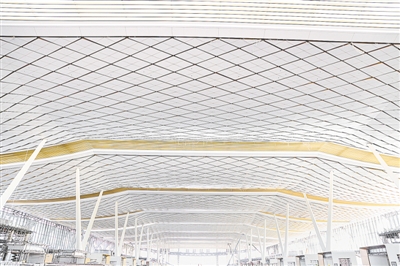 “本次完成施工的高架层吊顶灵感来源于莲鹤方壶顶部仙鹤羽毛,施工中以大面象牙白+折边青铜金色的菱形吊顶板为基本单元,整体室内吊顶其间由犹如黄河波浪起伏的连续肌理的青铜金色天窗带划分为10个区块。”郑州南站工程建设指挥部站房科相关负责人介绍说。