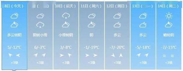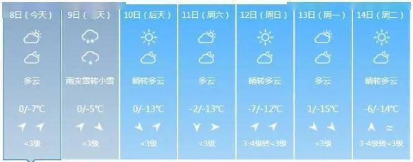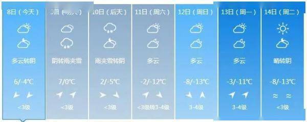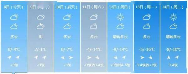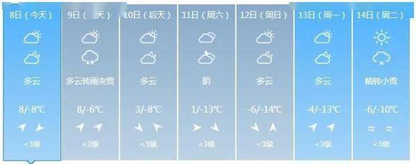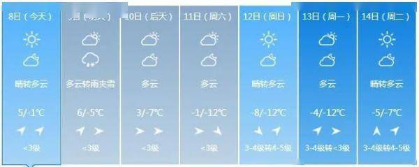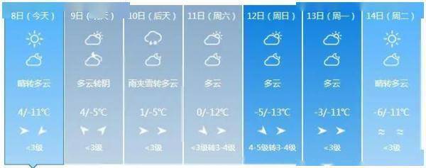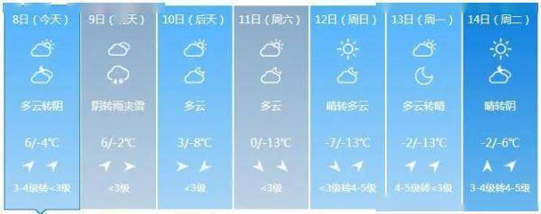 全省多云。最高气温:全省大部3~7度;最低气温:中西部大部-5~-1度,其他-10~-8度。中西部地区有3~4级西南风,其他地区有2~3级偏南风。
