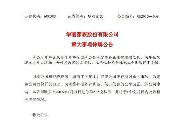 2015年1月20日,华丽家族发布“重大事项停牌”公告,称“截至本公告日,本公司正商讨定向增发股份融资,该融资将投资于临近空间飞行器项目、购买北京墨烯控股集团股份有限公司(以下简称“墨烯集团”)股份及其它等一系列事宜。”当日收盘价为6.65元,全天涨幅达5.25%。