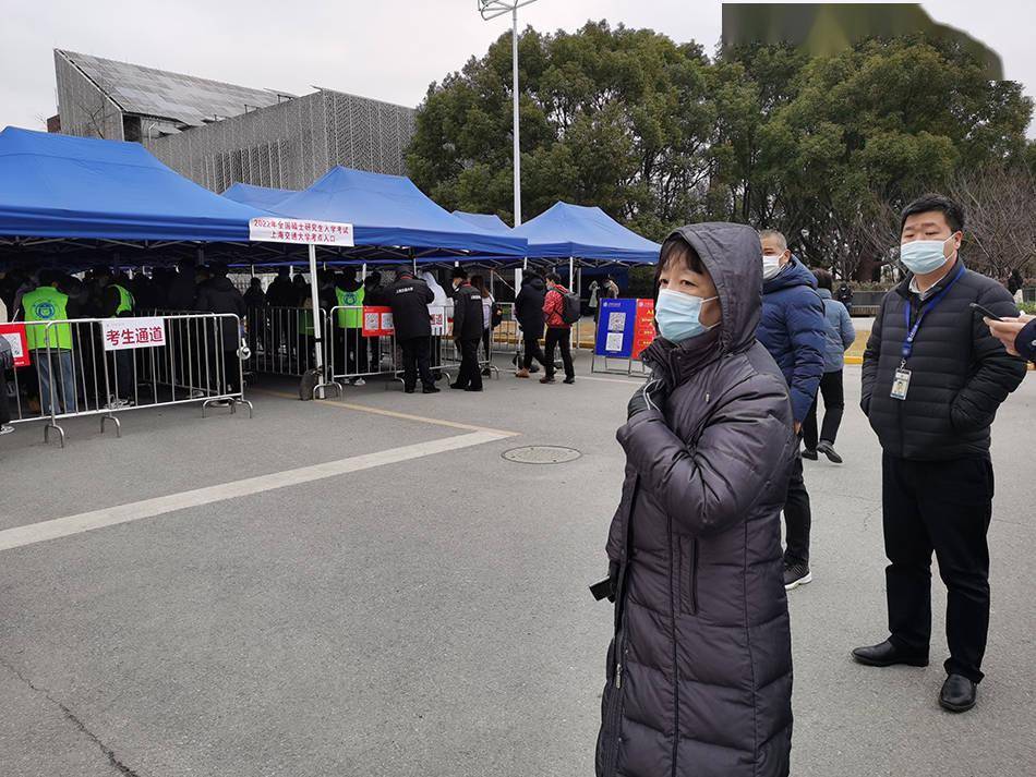 公安辅警在校门口的道路上指挥交通、方便考生快速上下车,同时,上海大学的保卫处工作人员及志愿者等分散在考场入口以及两侧道路稍远处,提醒考生们提前准备好48小时新冠病毒核酸检测阴性报告或“上海大学健康之路蓝码”。该蓝码系考生提前将随申码、行程卡、核酸检测报告、承诺书、准考证、身份证六项材料提交后,审批生成的电子凭证。