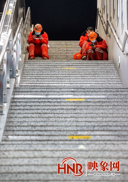 三位在地铁口避风休息的工人