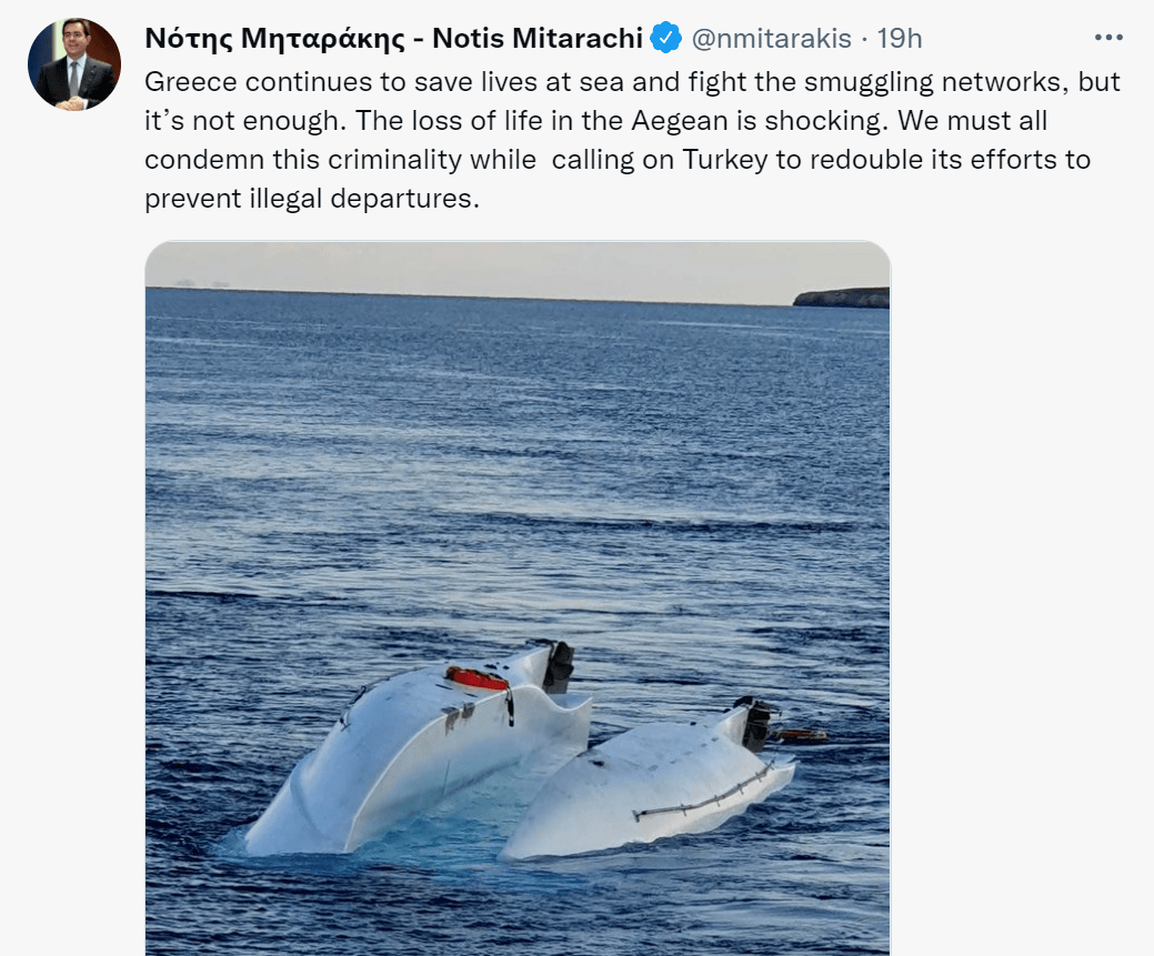 希腊移民部部长诺蒂斯·米塔拉希在社交媒体上呼吁土耳其禁止偷渡船只出港。/社交媒体截图