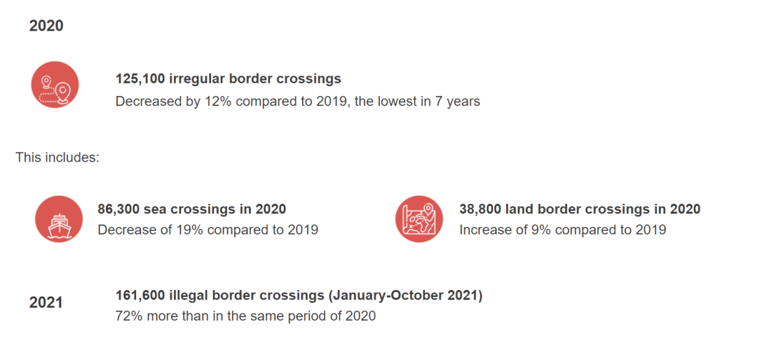 但进入2021年后,非法越境的事件次数再次上升。2021年1月至10月间,欧盟记录了16.16万次非法入境事件(illegal border crossings),较2020年同期增加了72%。