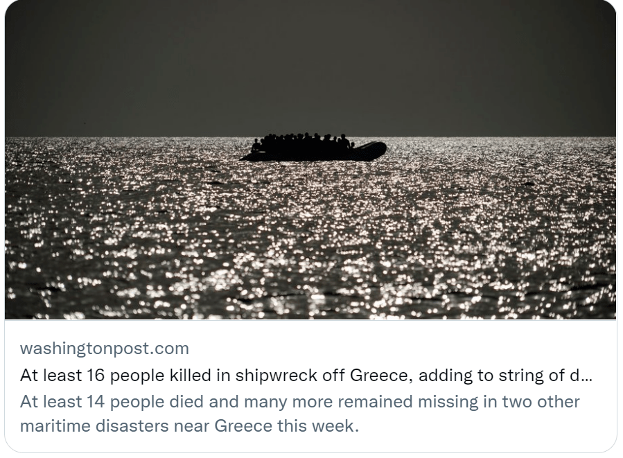 就在数小时后,希腊帕罗斯岛附近爱琴海海域又有一艘船只沉没,导致至少16人死亡,其中包括12名男性、3名女性和1名婴儿。63名获救者暂时被安置在帕罗斯岛上。目前,希腊政府仍在动用各方面资源营救落水人员。