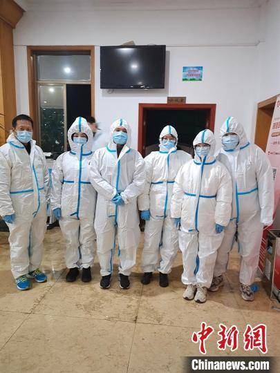 严小予(左三)和同事们穿好防护服。 严小予供图
