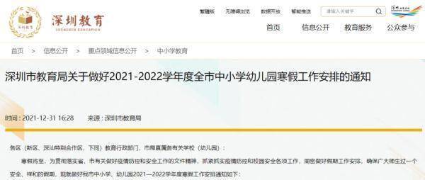 日前,深圳市教育局发布《关于做好2021-2022学年度全市中小学幼儿园寒假工作安排的通知》,2021—2022学年我市义务教育学校寒假从2022年1月16日开始,普通高中学校寒假从2022年1月23日开始。