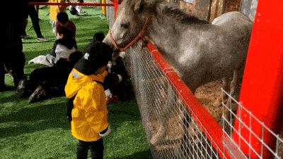 从罗先生提供的现场视频看,当时孩子站在投喂区,他单手拿着胡萝卜,对小马进行投喂 ,此时小马将头伸过栏杆,啃食胡萝卜。