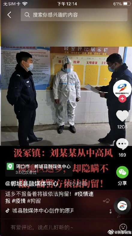 【周口#男子从上海静安区返乡未报备被拘留# 官方:系从中高风险地区返乡】据周口郸城县融媒体中心消息,郸城县汲冢镇王管村村民刘某某,在明知疫情防控返郸需要报备政策情况下,于2022年1月5日从上海市静安区返回郸城县汲冢镇王管村家中,截止1月17日,刘某某未进行过核酸检测,且未向村干部报备行程及身体健康状态。警方依法对刘某某采取行政拘留措施(先隔离后拘留)。(大象融媒)