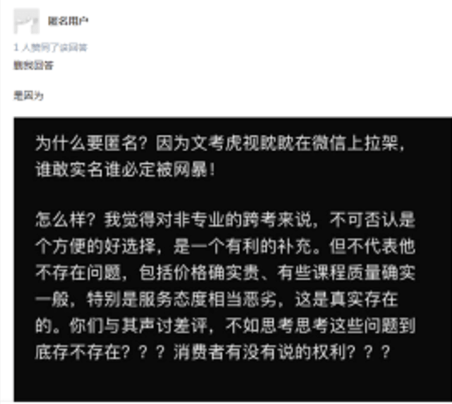 2020年初,张铭备战考研复试时,购买了文考网价值700元的课程班。2020年4月,在知乎的“文考网怎么样”的话题下,张铭匿名评价称:“为什么要匿名?因为文考虎视眈眈在微信上拉架,谁敢实名谁必定被网暴!怎么样,我觉得对专业的跨考来说,不可否认是个方便的好选择,是一个有利的补充。但不代表他不存在问题,包括价格确实贵、有些课程质量确实一般,特别是服务态度相当恶劣,这是真实存在的。你们与其声讨差评,不如思考思考这些问题到底存不存在?消费者有没有说的权利?”