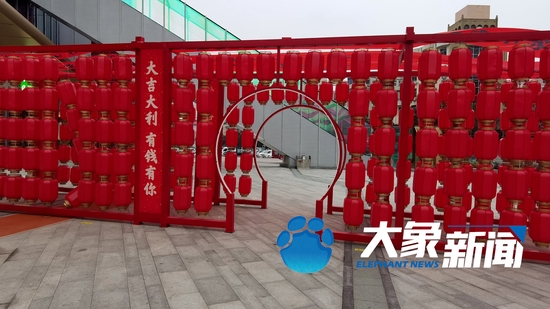 1月20日上午,郑州市人民路上大融城商场门前,搭着两个红色的长廊,上面挂满了红灯笼,写着吉祥话。“希望好运,不请自来”、“大吉大利,有钱有你”、“日富一日,年富一年”、“虎虎生福”等随处可见。
