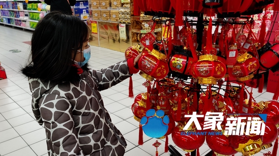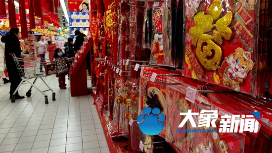 1月20日下午,在南三环世纪联华超市,入口处摆放着各种年货,红包、对联、中国结、红灯笼,琳琅满目。