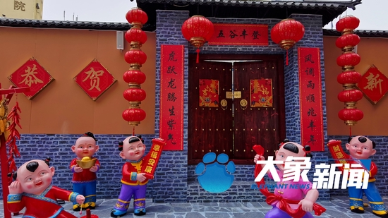 在二七路丹尼斯大卫城门前,也搭着多个红色喜庆的临时“景点”,营造过年气氛。其中一处“景点”再现了农村过年的典型场景:农家院的大门上贴着红色的年画,左右两边挂着红色的对联:虎跃龙腾生紫气,风调雨顺兆丰年。门前的几个小孩形态各异,有的手拿红色吉祥条幅,有的捧着金元宝,有的舞着红绸子,有的正在点炮仗。