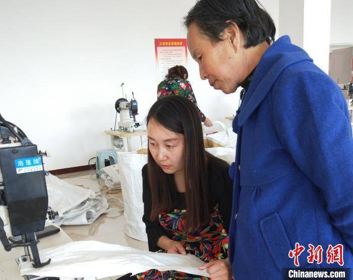 图为丁瑞锋(左)教授搬迁户缝纫技术。 张林虎 摄