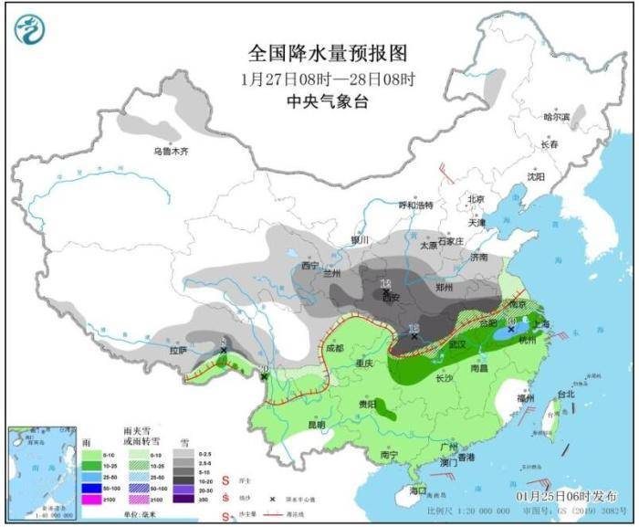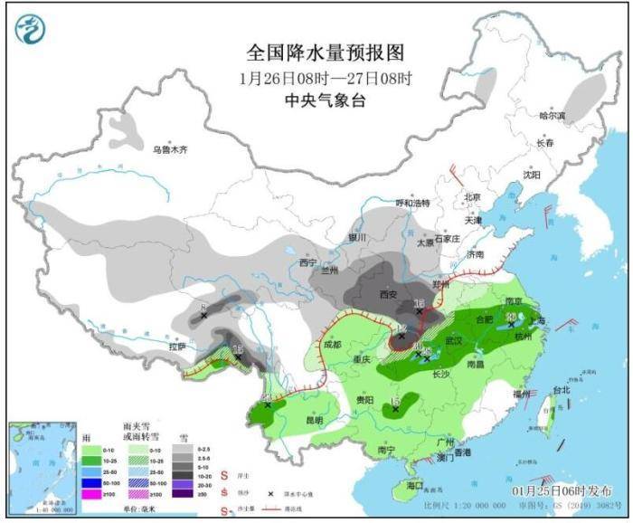 1月26日8时至27日8时,新疆南疆盆地、西藏东部和北部、西北地区大部、山西中部和南部、黄淮西部、江汉大部等地部分地区有小到中雪或雨夹雪,其中,西藏东南部、甘肃东南部、陕西中南部、河南西部、湖北西部和北部等地部分地区有大到暴雪(10~15毫米)。江淮大部、江汉东部、江南大部、西南地区东部和南部、华南大部等地部分地区有小到中雨,其中,湖南北部、安徽东部、浙江北部等地局地有大雨(25~30毫米)。内蒙古中部、华北北部部分地区有4~5级风。