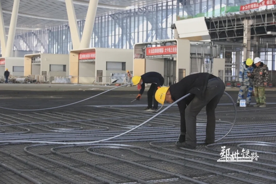 郑州南站候车大厅除了站房空调外,还在地面铺设了水循环管道。通过调节流动水温度,调节室温,地冷地暖有暖度无噪度,有凉感无风感,让旅客出行体验更美好。