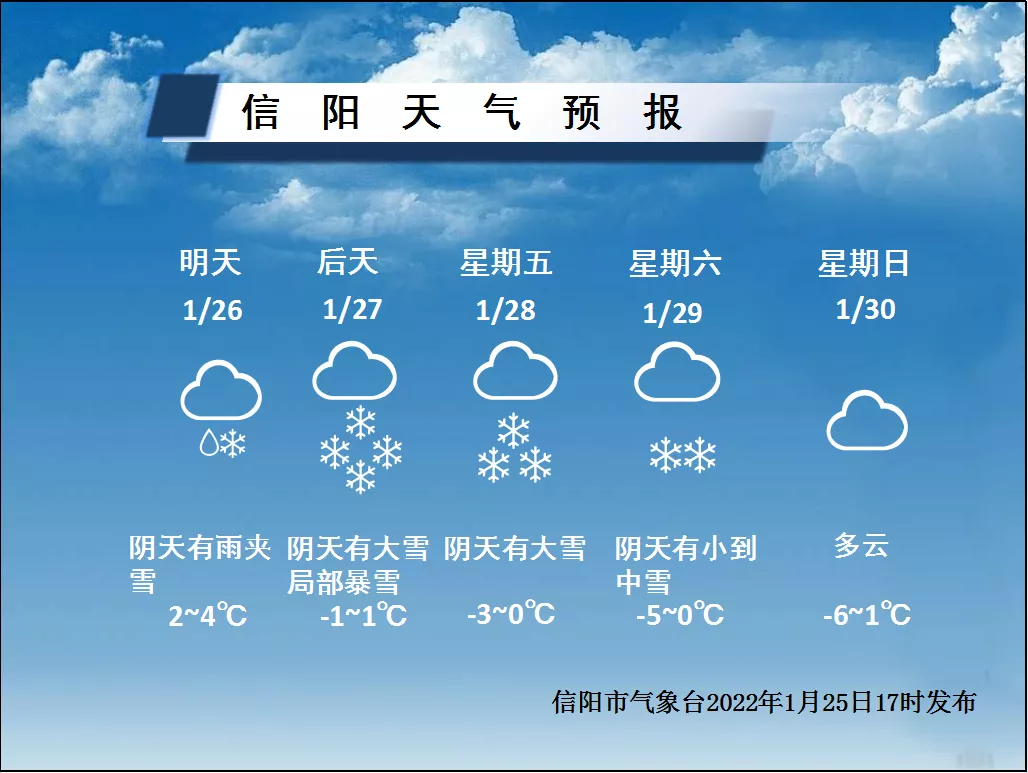 【再次预警!信阳27日到28日有大雪、局部暴雪】今天白天,雨雪暂缓,气温相比昨天稍有起色。短暂间歇之后,26-29日新一轮大范围雨雪天气将再次来袭其中,27日到28日有大雪、局部暴雪雨雪过程期间,冷空气补充南下,偏北风4~5级,30日到31日最低气温可降至-7~-6℃。(信阳气象)#信阳将迎大到暴雪#