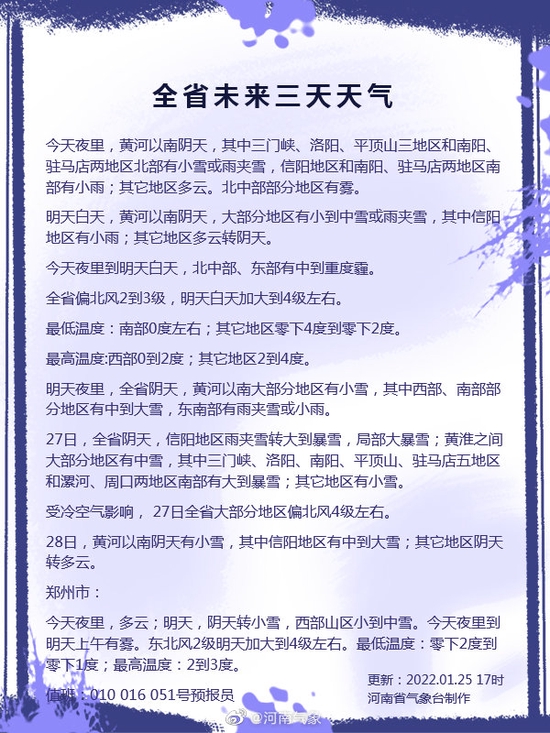 26日,阴天转小雪,西部山区有小到中雪,0~3℃。