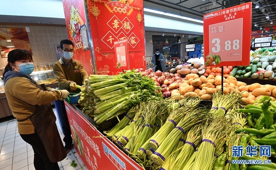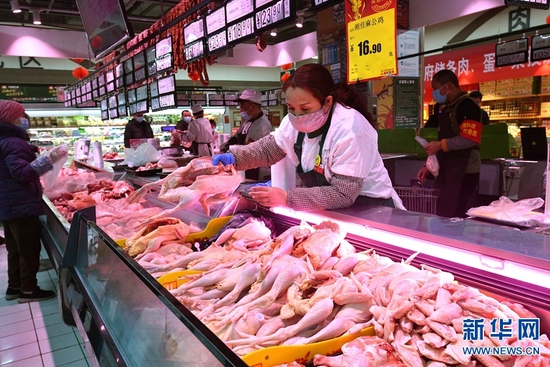 1月25日,郑州市长江路一家超市内“2022年春节政府储备肉蛋菜投放点”,工作人员在实时补货。