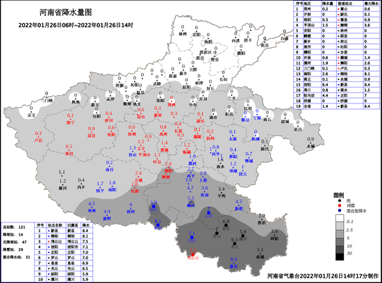 图3 2022年1月26日06时-14时河南省降水量实况图