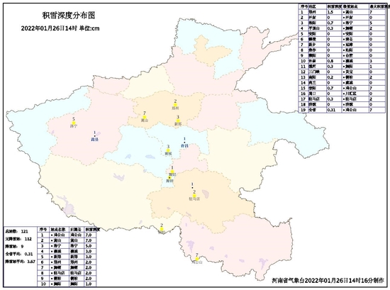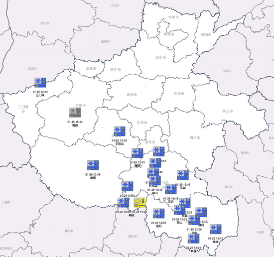 目前,河南省气象局仍处于重大气象灾害(暴雪、道路结冰)Ⅳ级应急响应,省气象台26日12时10分发布暴雪蓝色预警,全省各级气象部门共发布暴雪预警信号20条(图4)。