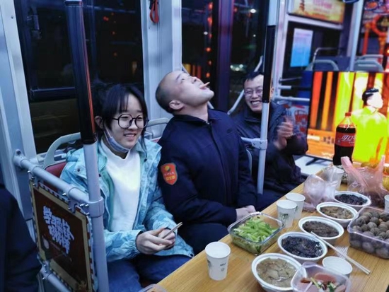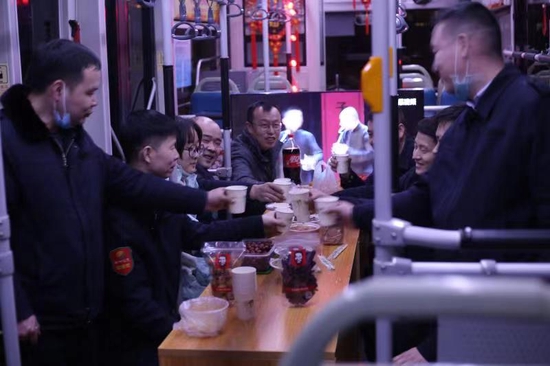 车长郑跃东不仅自己来了,他还带着女儿一起来了呢,说让女儿感受一下公交大家庭的温暖。大家你说一句,我聊两句,聊起了家人,共同举杯,庆祝新年,车厢内的氛围更加深厚,电视里联欢晚会还在继续,大家说着笑着闹着在声声祝福中迎接新的一年,迎接美好的明天。