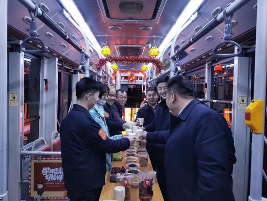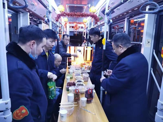 为了让公交车长们度过一个难忘的、欢乐祥和的春节,让留郑职工感受到公交大家庭的温暖,消除因为不能回家过年而产生的失落感。B5路的调度员和班组长就开始策划着车厢里的年夜饭,由于B5路情况特殊,至今没有自己的调度室,党员车长胡春霞就把自己的车厢装扮的喜气洋洋,火红的灯笼、火红的福字、漂亮的拉花,春节喜庆的氛围感染着每一个人。为了支持这场车厢里的年夜饭,公司工会帮助职工订购了扣碗、蔬果、蜜饯等,还专门安装了电视机供大家观看春晚,而职工们更是捧出自己的拿手好菜,共同进行品尝。
