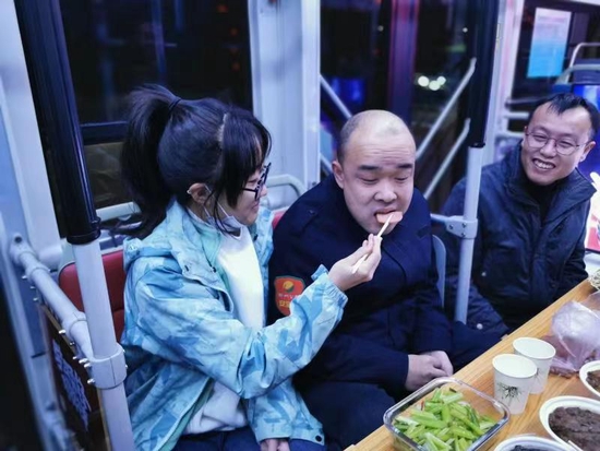 冯明会带着儿子给叔叔阿姨拜年、李航一直拍照发朋友圈留念、郑跃东和母亲连线并送上新春祝福、年轻车长罗丹丹通过视频告诉远方的母亲自己和大家在一起过新年、看春晚……大家伙吃着、笑着、闹着,相依为伴,共同迎接即将到来的新春佳节。