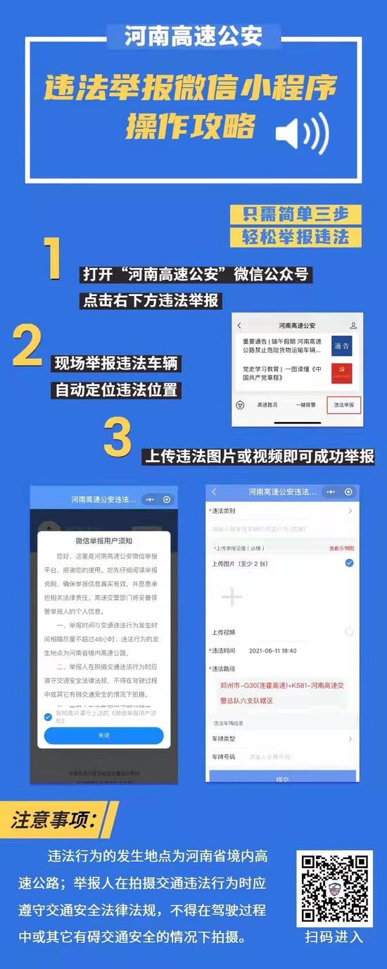 [违法举报]警民携手,让违法车辆无处藏。对在河南省内高速公路上发现的违法占用应急车道、超员、不按规定车道行驶等违法行为时,广大群众可以通过拨打河南高速交警报警电话0371-68208110、河南高速交警微信公众号中“违法举报”栏目进行举报。据高速交警介绍,在“河南高速交警”微信公众号“违法举报”栏目举报违法车辆可以直接准确确定违法车辆所在位置,举报更有效。