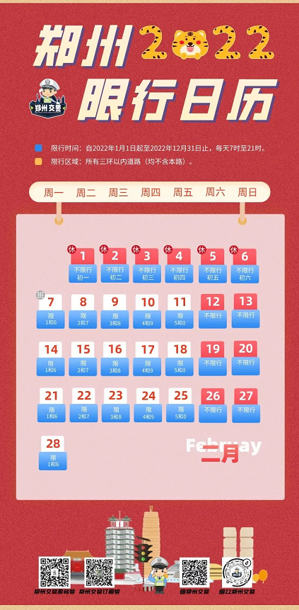 另外2月7日(正月初七)周一,是春节假期后第一个工作日,当天机动车尾号限行1和6,请大家不要违反;当天早上7时至9时,郑州市中州大道(南三环至农业路)、陇海路高架桥、农业路高架桥西向东方向、京广路高架桥双向、西三环(淮河路至化工路)、北环彩虹桥一层、金水路、花园路、中原路、嵩山路等道路车流量大,请大家错峰有序通行。