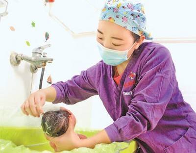 2月3日,在安徽淮北友好妇产医院,助产长在细心地为新生儿沐浴。