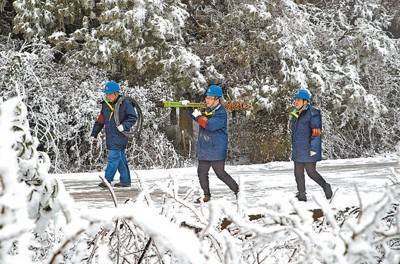 2月2日,贵州省黔西市中建苗族彝族乡红板村,电力工人踏着冰雪前往电网故障点抢修。