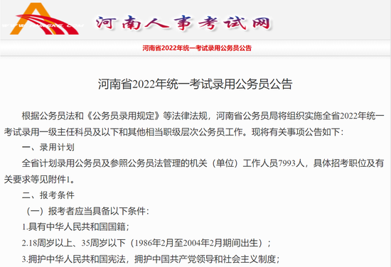 河南省公务员局今天(2月11日)发布河南省2022年统一考试录用公务员公告。全省2022年计划录用公务员及参照公务员法管理的机关(单位)工作人员7993人,其中,20个省级机关(单位)及其直属机构计划招录452人,17个省辖市和济源示范区计划招录7541人。