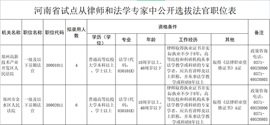 为进一步拓宽法官、检察官选任渠道,优化队伍结构,本次河南公务员省考首次开展从律师和法学专家学者中公开选拔法官试点工作。郑州高新技术产业开发区人民法院拟招录4名一级及以下员额法官,郑州市金水区人民法院拟招录6名一级及以下员额法官,均要求普通高等院校大学本科以上、学士以上学历,并具备“律师取得执业证书并实际执业不少于8年;高等院校和科研机构从事法学教学或科研的专家学者,应具有讲师及以上职称,并从事法学教学或科研8年以上”的工作经历。