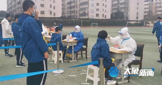 大象新闻记者在郑州市第四十七中学操场上看到,整个操场被分为本校学生与幼儿园两个检测区域,其中四十七中初中部排了4队、幼儿园排了5队,在现场工作人员的带领下分批、有序进行核酸检测。“排队做的挺快,我连排队带做检测,用了不到30分钟。”一名刚刚做完核酸检测的学生说到。