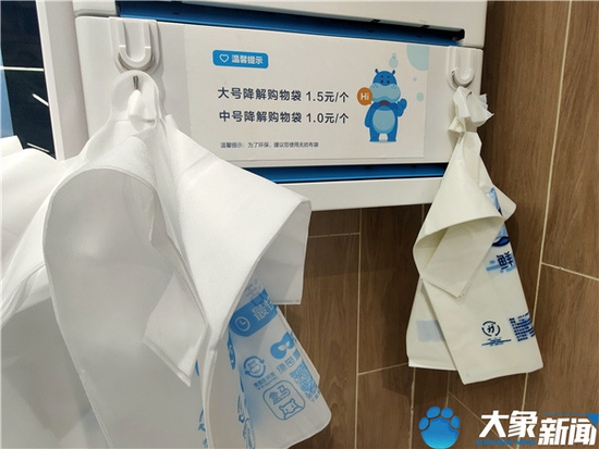 “大号0.7元,小号0.4元。”在该超市自助收银台,一次性塑料袋明码标价,商家贴出提示,“为了更好地执行国家规定,落实‘限塑令’的实施,拒绝白色污染,环保从我做起,保护绿色地球。我们有偿提供给顾客的购物袋是可以重复使用的。”
